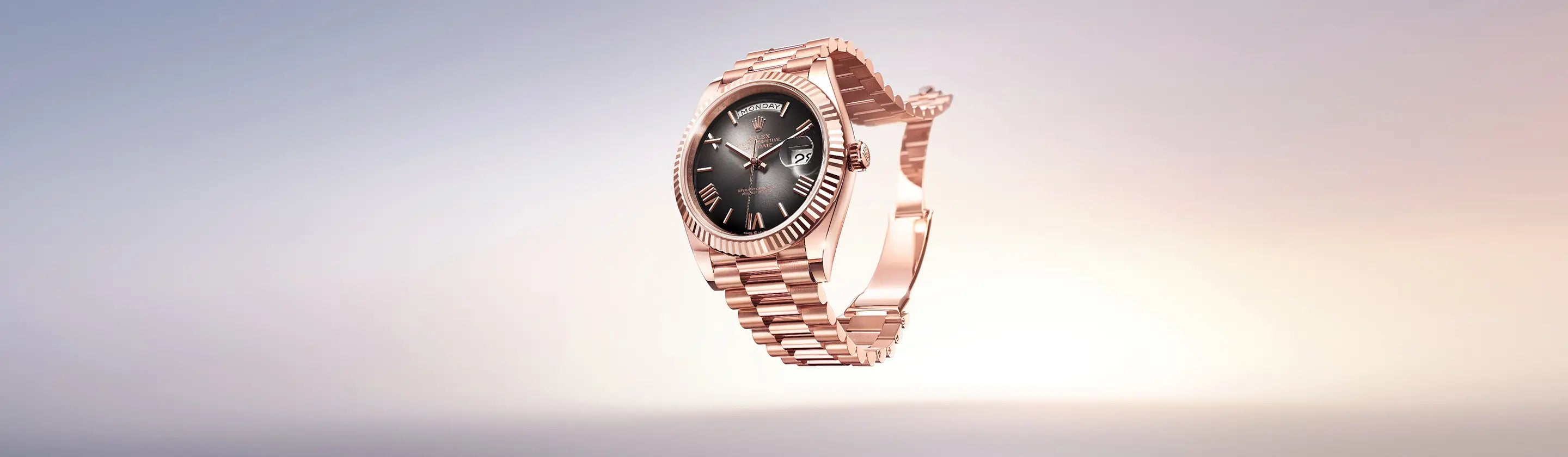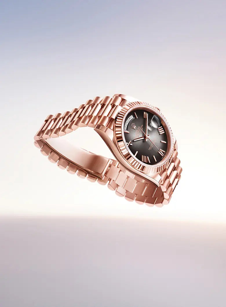 El Day‑Date 40 estrena unas esferas sombreadas. La modalidad fabricada en oro Everose de 18 quilates presenta una esfera de color pizarra sombreado. Se trata de una esfera inédita tanto por la tonalidad, pues el color del