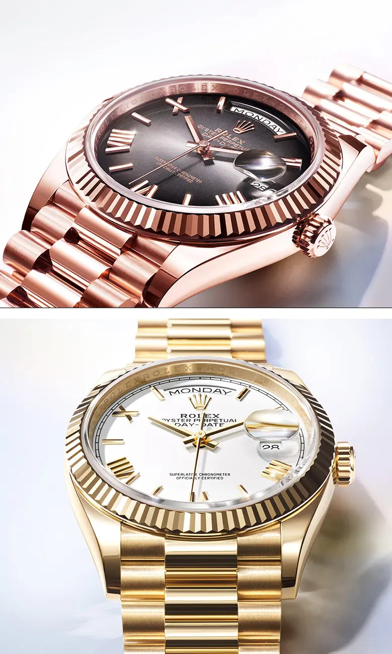 Rolex enriquece su gama Day‑Date con unas nuevas modalidades del Oyster Perpetual Day‑Date 40 y del Oyster Perpetual Day‑Date 36 que lucen unas esferas exquisitamente elaboradas.