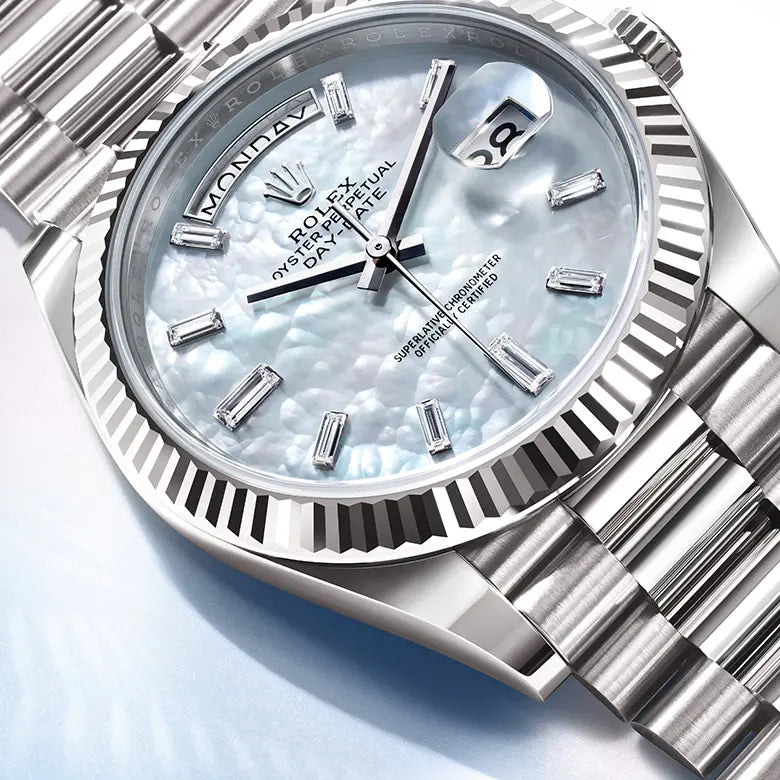 en oro blanco de 18 quilates, la segunda modalidad del Day‑Date 40 viste su esfera de nácar blanco perlado. Es la primera vez que este modelo luce este material natural. En esta modalidad, el brillo del nácar de la
