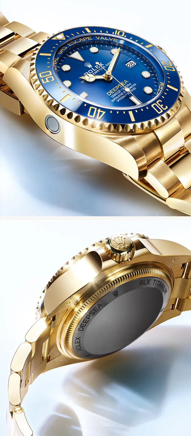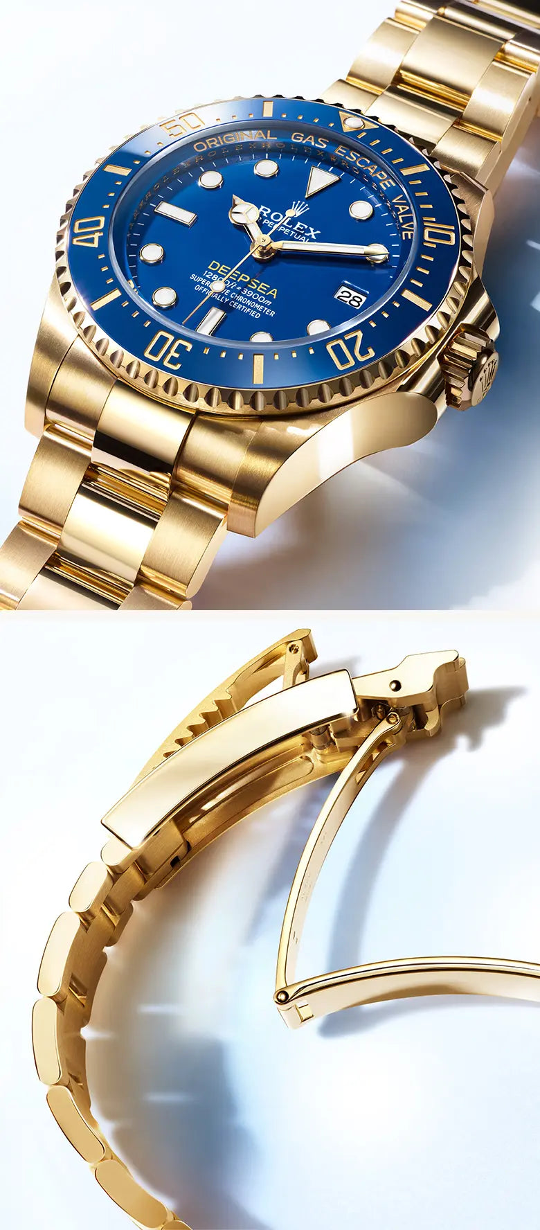 Por primera vez, este reloj de submarinismo está disponible en oro amarillo de 18 quilates y luce un bisel con disco Cerachrom graduado 60 minutos en cerámica azul, así como una esfera lacada azul, ensalzada con la inscripción «DEEPSEA» en amarillo empolvado.