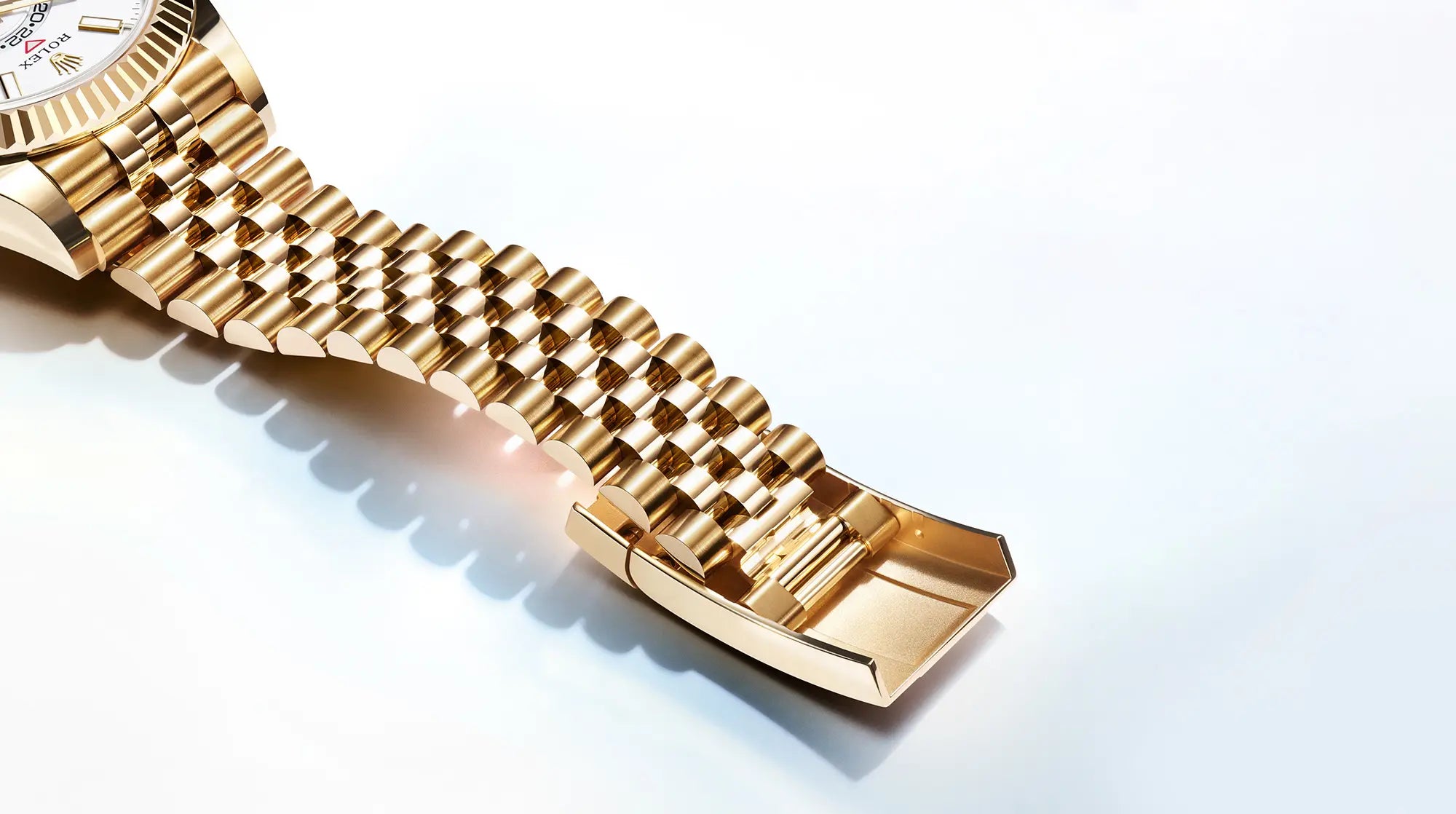 Las nuevas modalidades del Sky‑Dweller están provistas de un brazalete Jubilee. Fluido y confortable, este brazalete metálico de cinco elementos se creó específicamente para el Oyster Perpetual Datejust, lanzado en 1945.