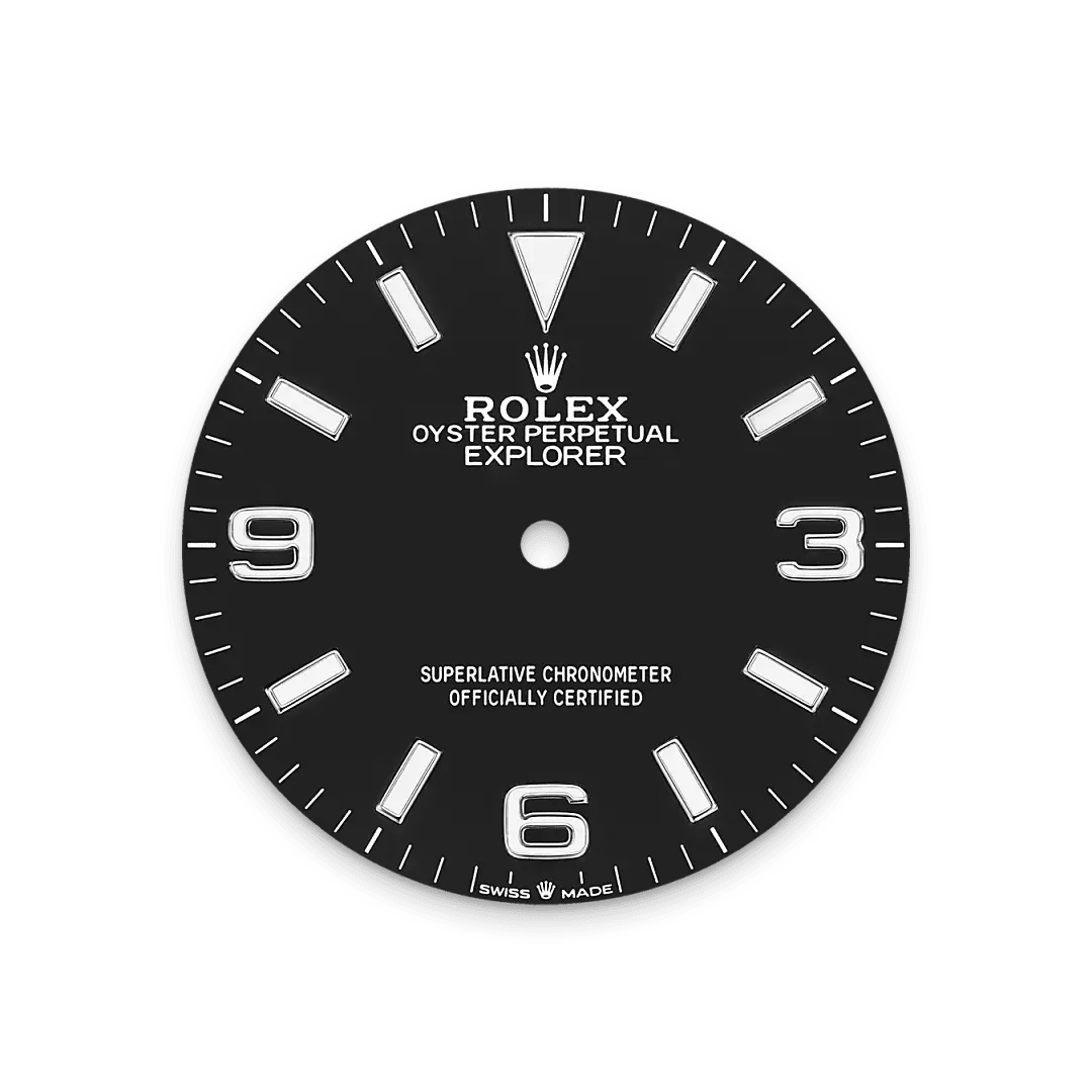 La esfera es el rostro distintivo de un reloj Rolex, el mayor responsable de su identidad y legibilidad. Los números 3, 6 y 9, característicos del modelo Explorer, están rellenos de un material luminiscente, que emite un color azul de larga duración, igual que los índices y las agujas. Como todos los relojes Rolex, la esfera del Explorer 36 está diseñada y manufacturada en nuestros talleres, principalmente a mano, para garantizar su perfección.