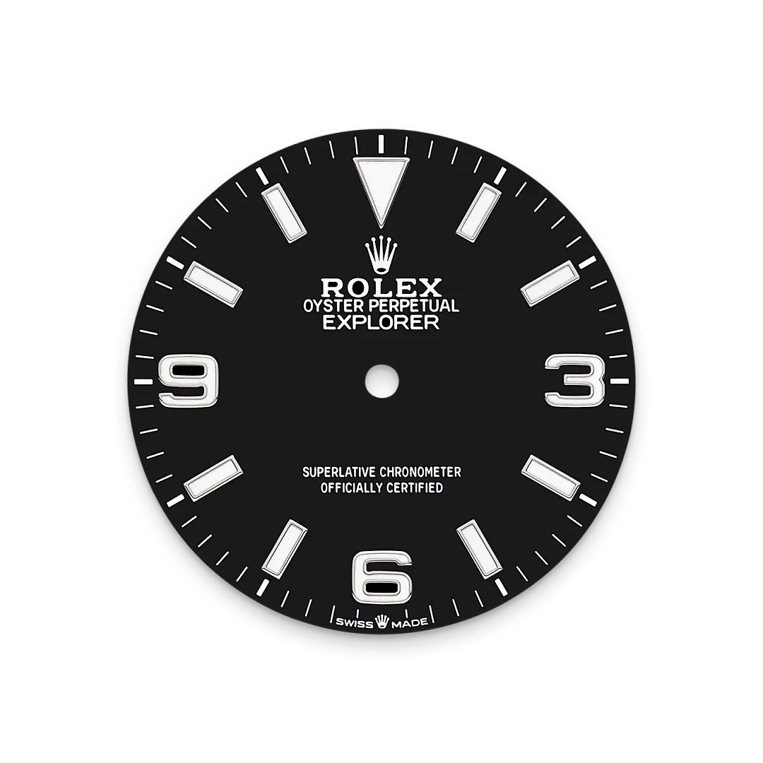La esfera es el rostro distintivo de un reloj Rolex, el mayor responsable de su identidad y legibilidad. Los números 3, 6 y 9, característicos del modelo Explorer, están rellenos de un material luminiscente, que emite un color azul de larga duración, igual que los índices y las agujas. Como todos los relojes Rolex, la esfera del Explorer 40 está diseñada y manufacturada en nuestros talleres, principalmente a mano, para garantizar su perfección.