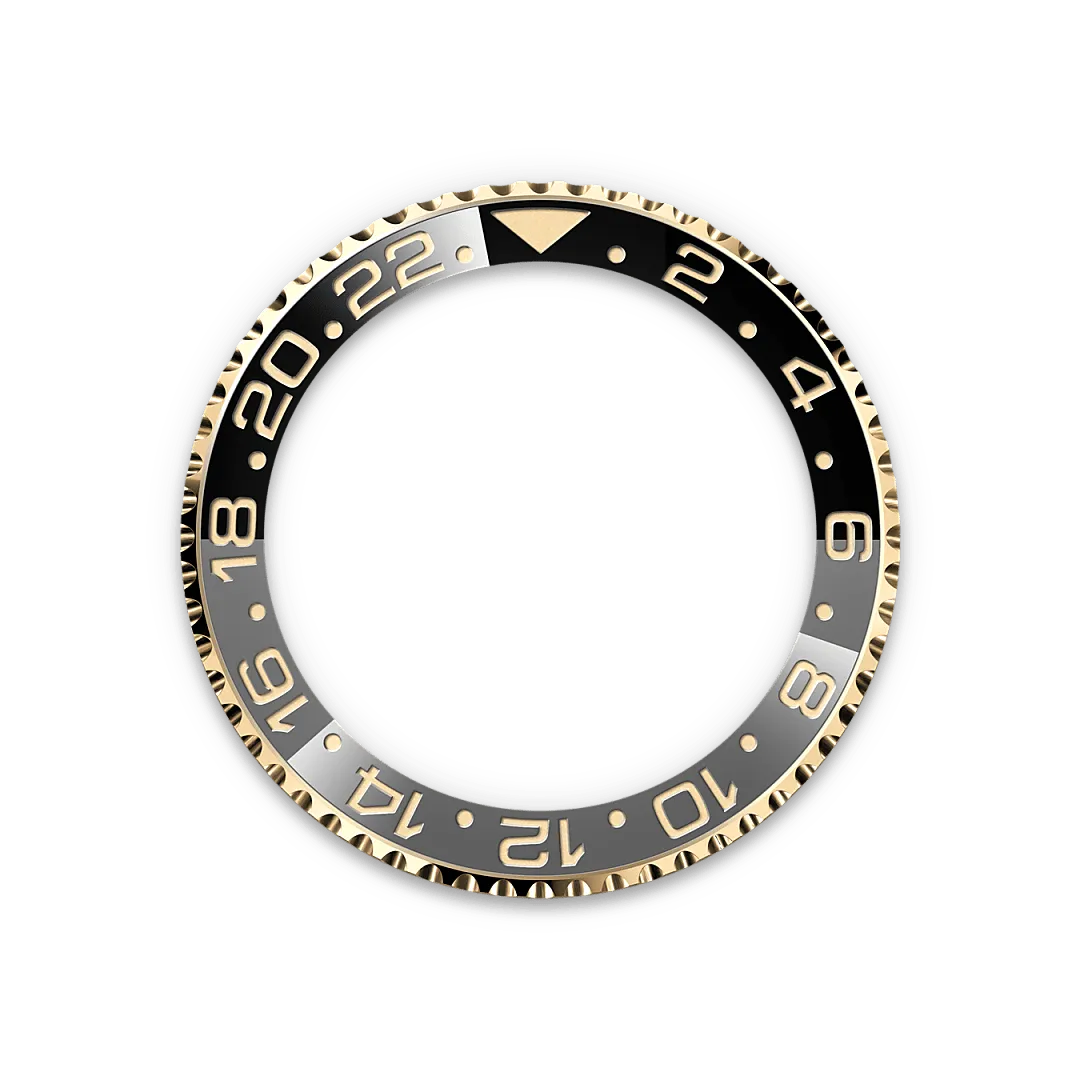 Este modelo presenta una esfera negra y un disco de bisel Cerachrom bicolor en cerámica gris y negra bicolor. El GMT?Master II dispone de una aguja adicional que da la vuelta a la esfera en 24 horas y complementa a las tradicionales agujas de las horas, minutos y segundos, así como de un bisel giratorio bidireccional graduado 24 horas. La aguja adicional de 24 horas, con su color distintivo, indica la hora de referencia, la del lugar de residencia, en un primer huso horario que se lee sobre la graduación del bisel. La hora local del viajero puede ajustarse fácilmente mediante saltos de hora en hora gracias a un astuto mecanismo controlado por la corona: la aguja de las horas puede ajustarse hacia delante o hacia atrás, de forma independiente del minutero y el segundero. Esto permite al viajero adaptar su nuevo huso horario sin que afecte a la precisión.