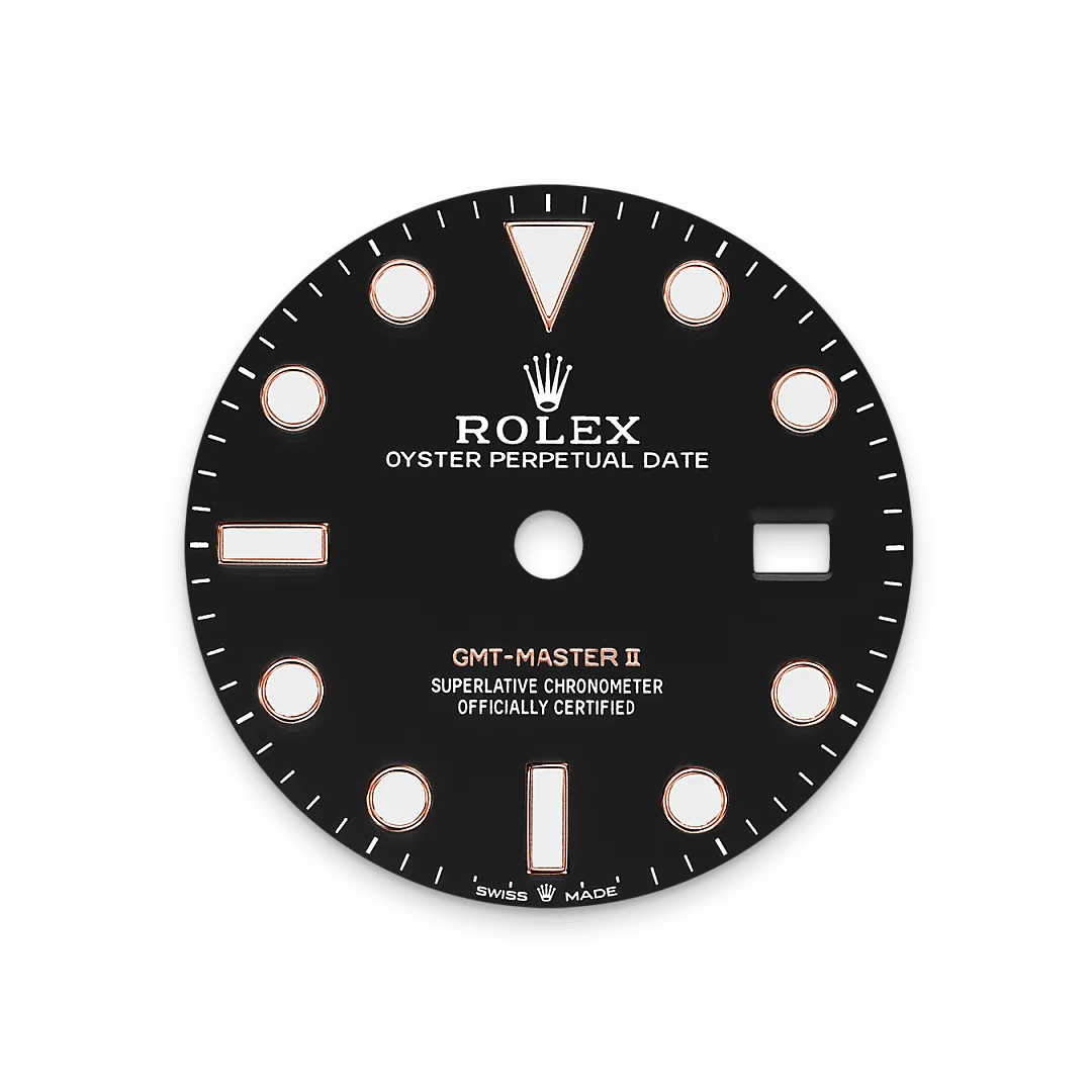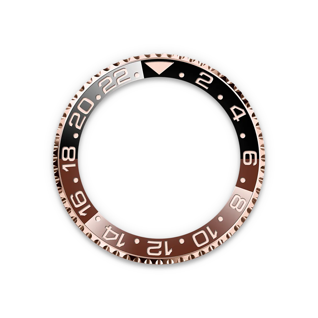 Este modelo presenta una esfera negra y un disco de bisel Cerachrom bicolor en cerámica marrón y negra bicolor. El GMT?Master II dispone de una aguja adicional que da la vuelta a la esfera en 24 horas y complementa a las tradicionales agujas de las horas, minutos y segundos, así como de un bisel giratorio bidireccional graduado 24 horas. La aguja adicional de 24 horas, con su color distintivo, indica la hora de referencia, la del lugar de residencia, en un primer huso horario que se lee sobre la graduación del bisel. La hora local del viajero puede ajustarse fácilmente mediante saltos de hora en hora gracias a un astuto mecanismo controlado por la corona: la aguja de las horas puede ajustarse hacia delante o hacia atrás, de forma independiente del minutero y el segundero. Esto permite al viajero adaptar su nuevo huso horario sin que afecte a la precisión.