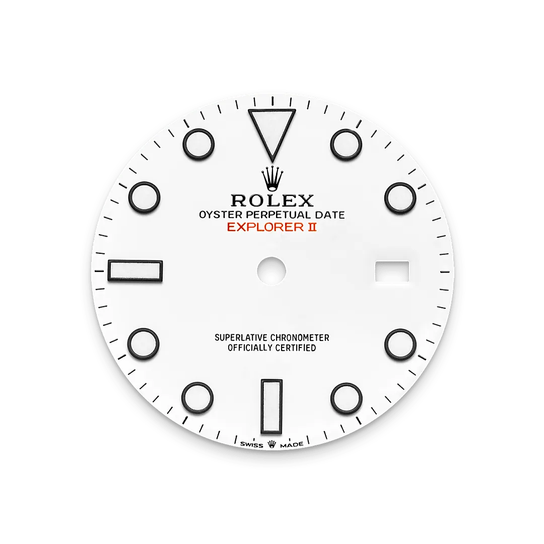 El Explorer II está equipado con la visualización de la fecha, una aguja adicional 24 horas y un bisel fijo con graduaciones 24 horas que permite distinguir las horas del día de las de la noche. Se convirtió en el reloj de espeleólogos, vulcanólogos y exploradores de las regiones polares. Sus agujas e índices presentan una visualización Chromalight de alta legibilidad con luminiscencia azul de larga duración.